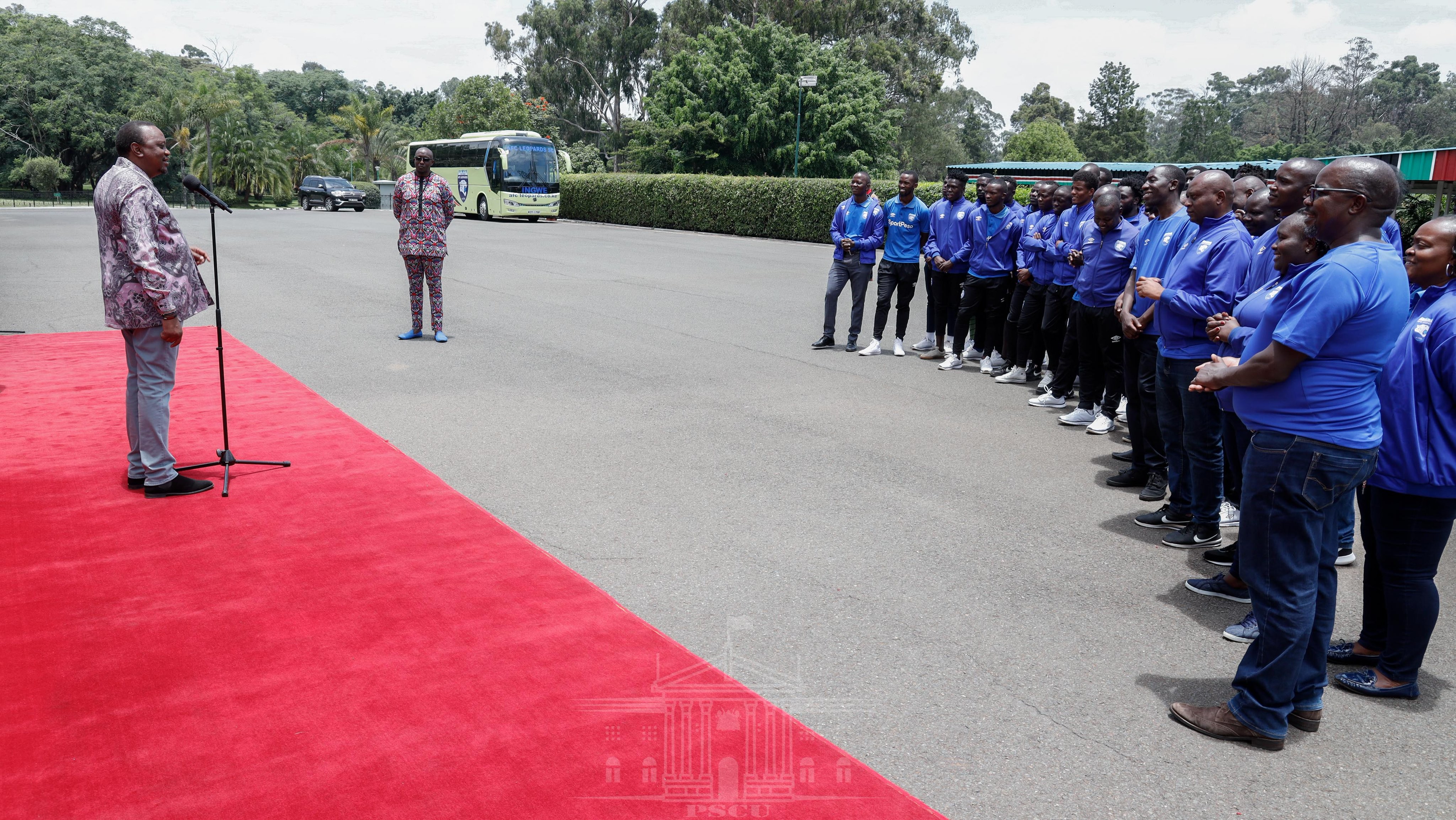 President uhuru kenyatta shakes hands with afc leopards players when he officially handed over a new bus to the team at state house, nairobi on.
